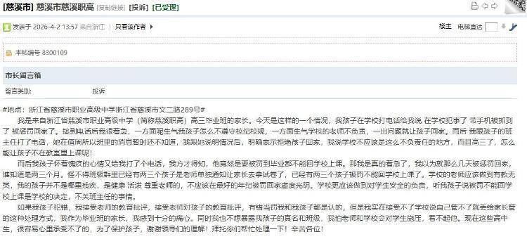 近日,网友反映,其为浙江慈溪职业高级中学高三毕业班的家长,自己的孩子在校带手机,被罚离校回家,一直待到毕业,时间长达2个多月,质疑学校处罚过重。
